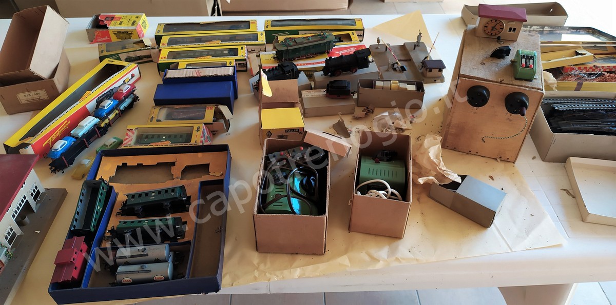 La collezione comprende anche due trasformatori d'epoca, una stazione, un posto di blocco e persino un orologio da stazione in scala. Inoltre, una scatola contiene un gran numero di rotaie per creare un circuito ferroviario, pulsantiere e scambi. Un pezzo davvero affascinante è la bisarca, che presenta alcuni segni di ruggine ma che sicuramente renderò più presentabile dopo un po' di manutenzione.